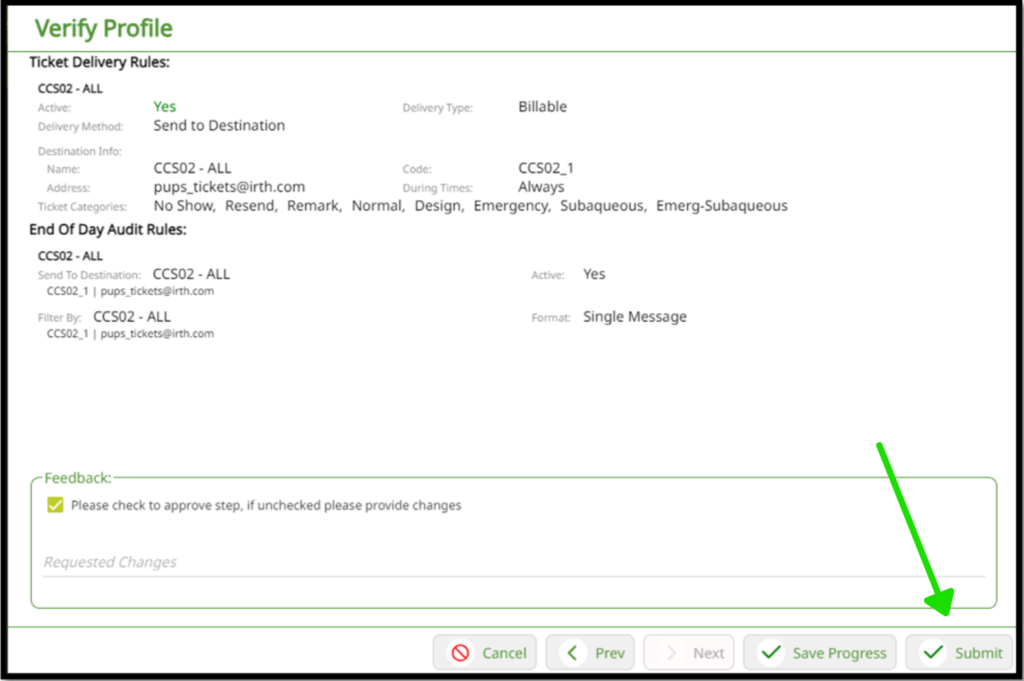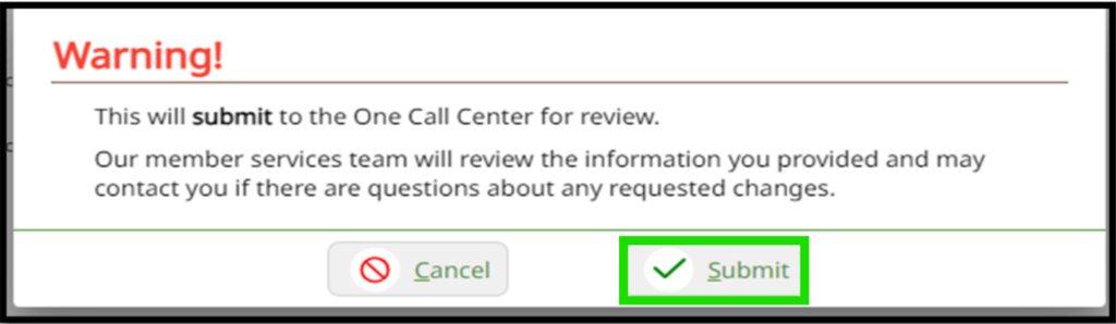 Once you click ‘Submit,’ a pop-up box appears, letting you verify that you are ready to submit this to the one call center for review. Click ‘Submit’ to complete the process.